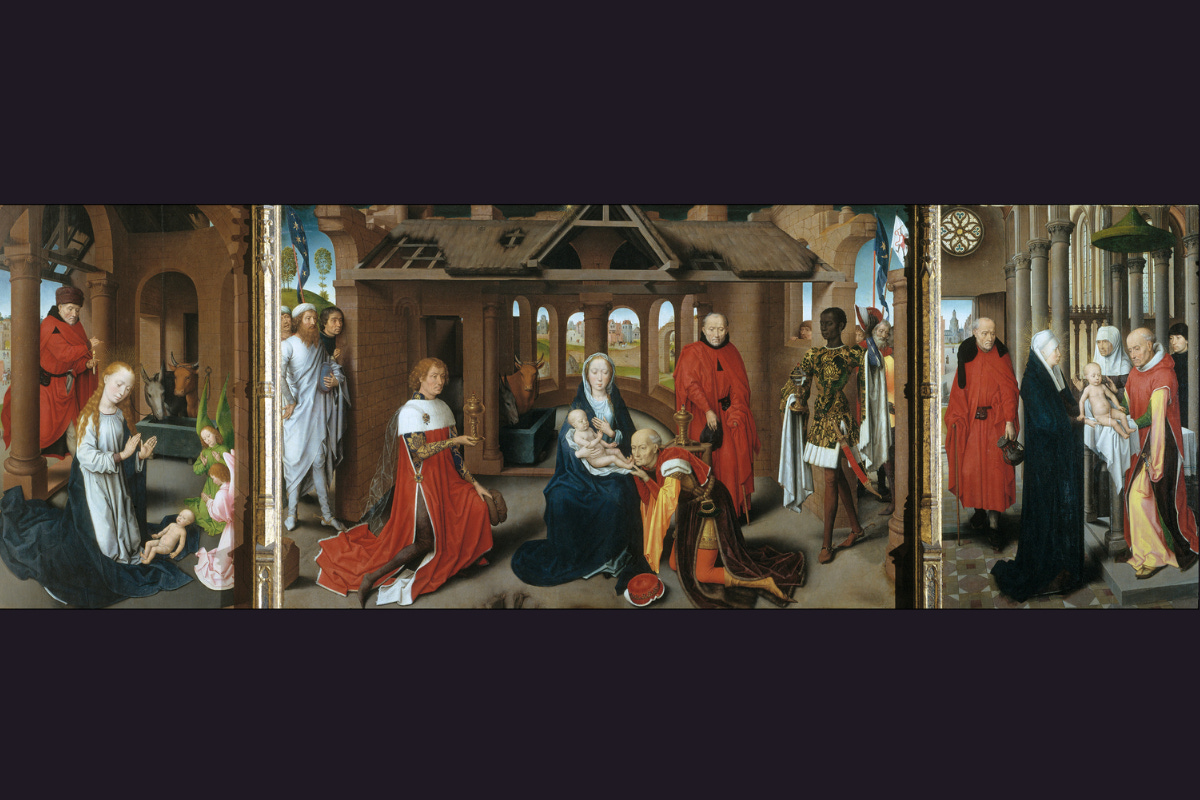 The idealised generalisation of contemporary Italian painting is quite absent: here, everything is observed as if in the everyday world. These are all very real people, living out actual lives in a known country - a Flemish landscape that comes into view through each window opening in this complex architectural stage-set. The story of the birth of Christ is told in three separate scenes – a well-known narrative technique: the Nativity, the Adoration of the Magi, and the presentation of the Child in the Temple.